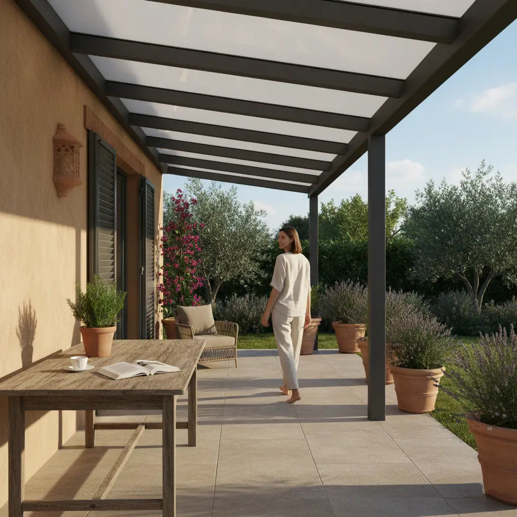 Veranda in alluminio antracite con tetto in policarbonato opale: luce morbida senza abbaglio, più comfort d’estate e protezione da pioggia e raggi UV. Struttura in alluminio 6063-T6 verniciato a polvere, zero ruggine e zero manutenzione. Montaggio fai-da-te in 1–2 giorni con manuale e video inclusi.